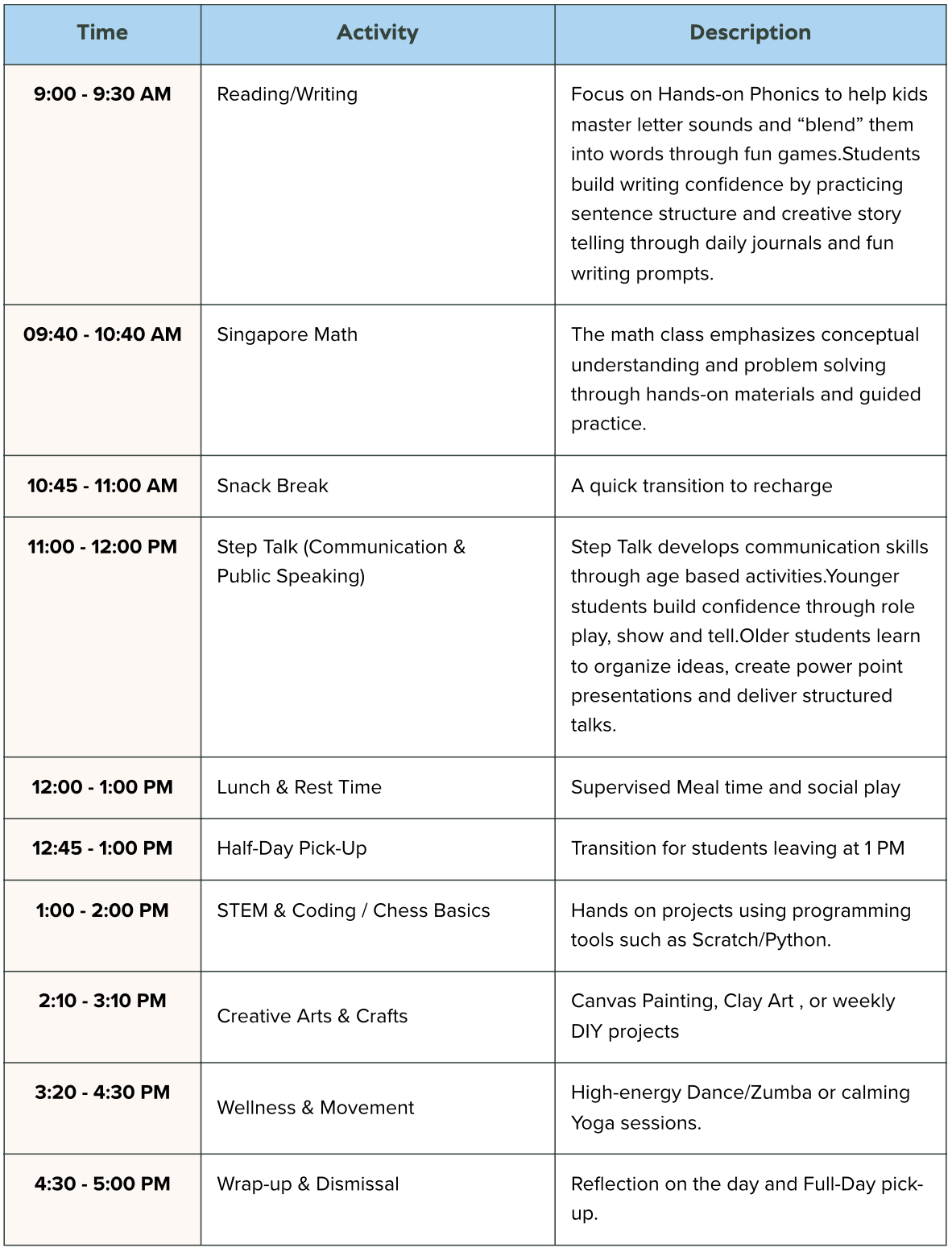 Each child’s learning plan is personalized based on ability and readiness, not just age or school grade, ensuring steady progress and confidence at every level.
